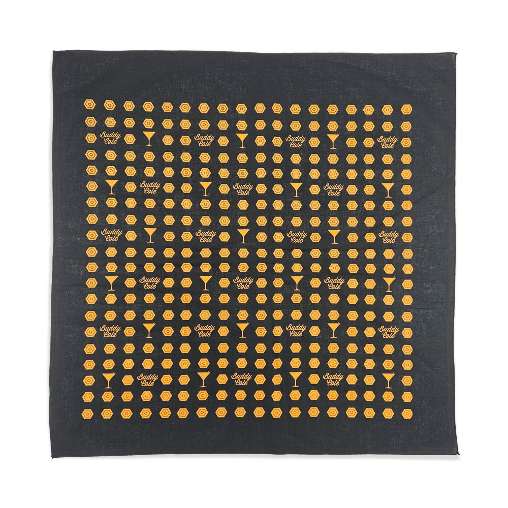 Black bandana/ascot with Buddy Cole martini pattern. 27” x 27”